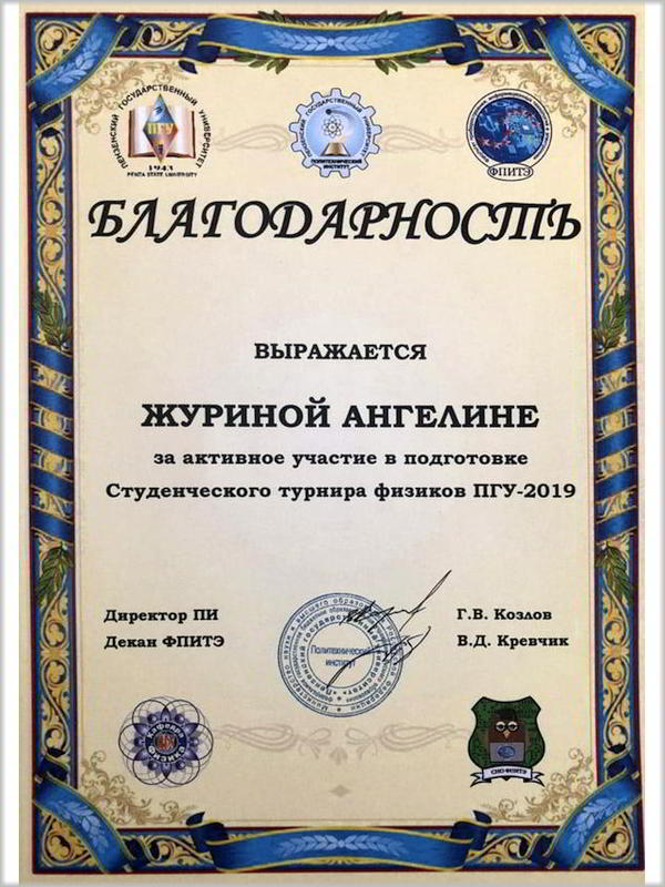 29 апреля на ученом совете ФПИТЭ состоялось награждение студентов группы 18ПФ1 дипломами 3 степени за активное участие в студенческом турнире физиков ПГУ, который состоялся 25 марта. Благодарственное письмо декан факультета Кревчик В.Д. вручил Журиной Ангелине за помощь в организации данного мероприятия.