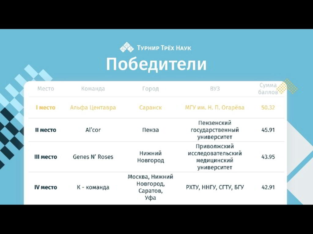 Команда «ALCOR», в которую вошли студенты Политехнического института ФИТЭ (декан Кревчик В.Д.) и ФМиТ (декан Киреев С.Ю) заняла II место на региональном этапе Турнира Трех наук, который проходил с 20-22 ноября в этом году, к сожалению, в дистанционном формате. Но данный формат позволил большему количеству команд Приволжского федерального округа принять участие в Турнире. В состязаниях участвовали 15 команд ПФО, а в частности, г. Саранска, г. Ульяновска, г. Нижнего Новгорода, г. Уфы, г. Оренбурга, г. Пензы, г. Казани, Башкортостана, Чувашии.