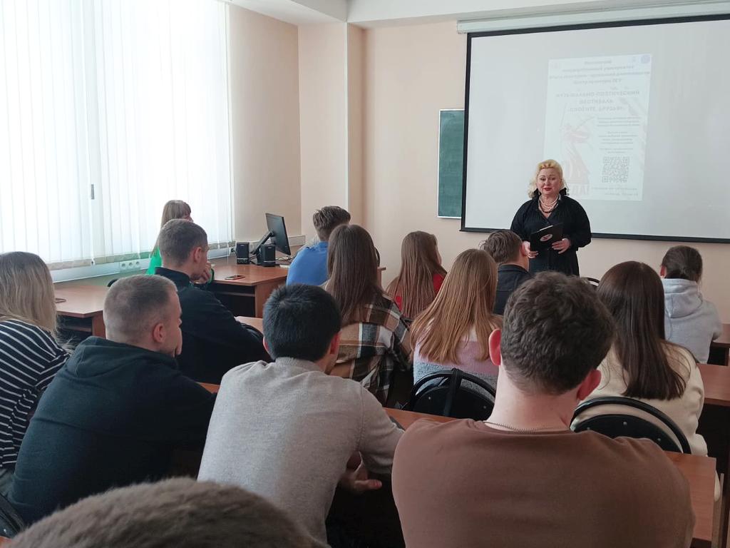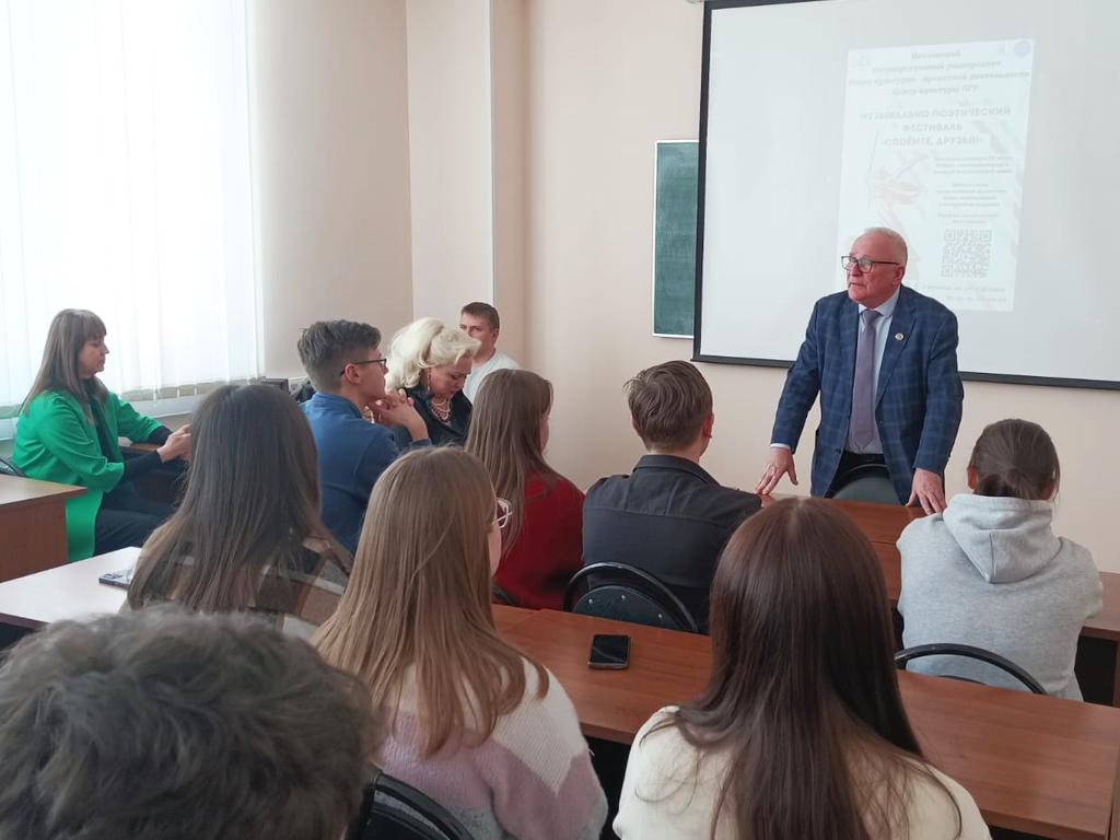 17 февраля на кафедре состоялось мероприятие в рамках музыкально - патриотического фестиваля "Споемте вместе, друзья". Участниками стали заведующий кафедрой "Физика" Кревчик В.Д., студенты - физики и кураторы Грозная Е.В. и Туманова Л.Н. Ребята не только познакомились с историей создания известных песен военных лет "Три танкиста" и "Смуглянка", но и с удовольствием пели хором под руководством заслуженного работника культуры РФ Тарховой Аллы Александровны.
